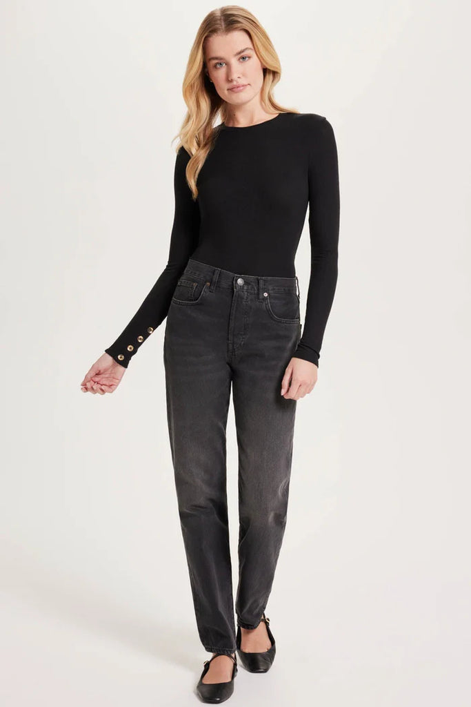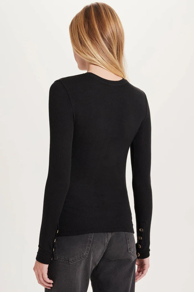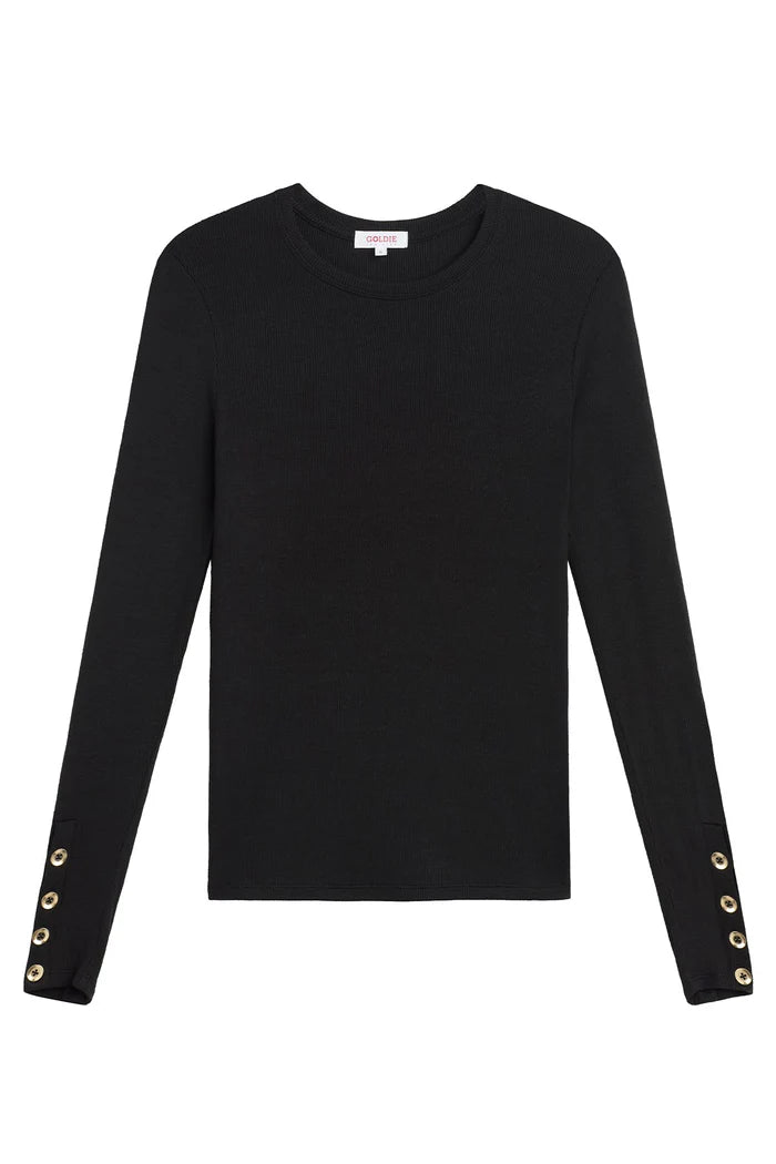 Luxe and cozy: a ribbed crewneck top with a row of gold buttons on each cuff. Unfasten a couple of buttons for a laid-back look.